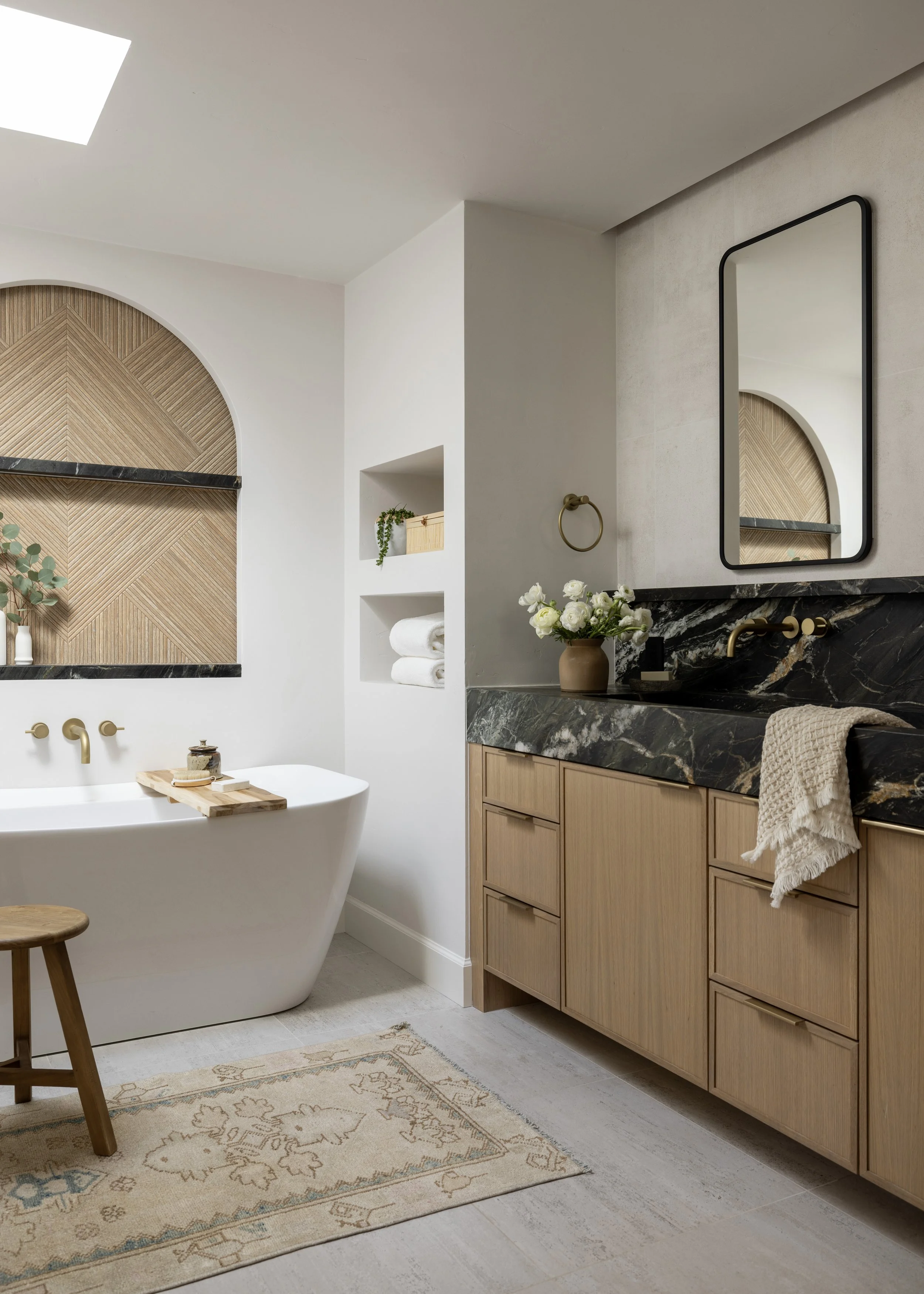 Sophisticated, serene, and designed for everyday luxury—discover how Natalia Avalos transformed an Oakland primary bath into a retreat with bold stone, warm textures, and thoughtful details.