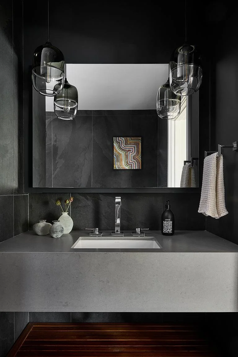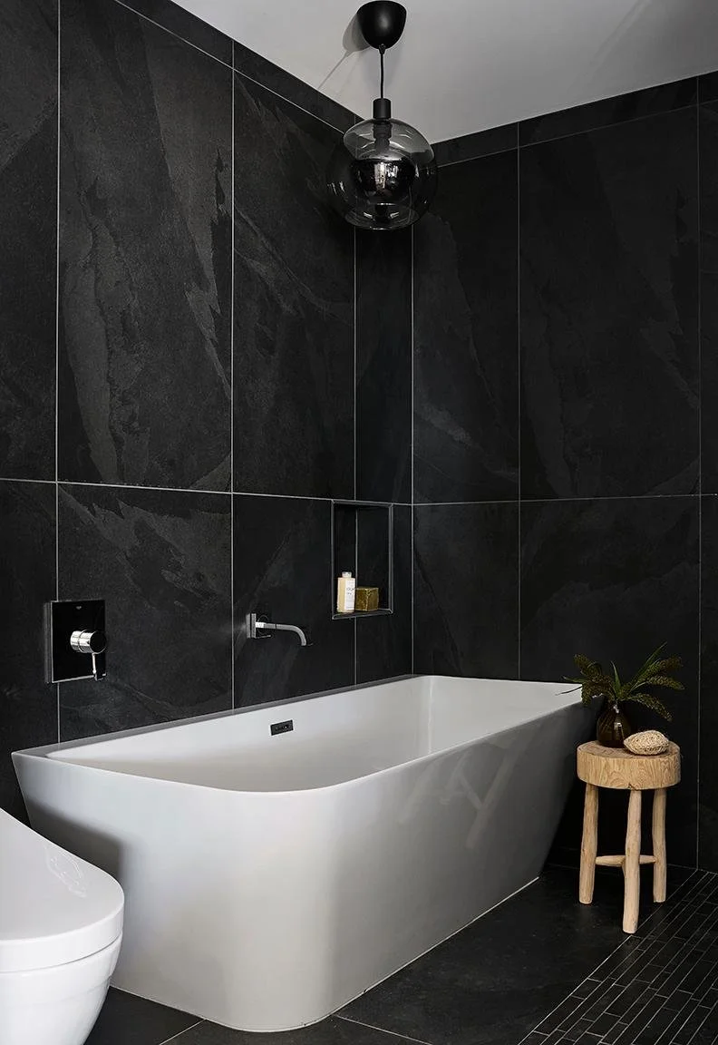 This stunning spa-like bathroom was designed for a well-traveled expat client. Inspired by luxurious hotel bathrooms from around the world, Trish and her team embraced a darker palette to create a moody, sophisticated retreat. The absence of natural light in the space informed the design direction, while the client’s request for a slate-look finish guided the material selection.