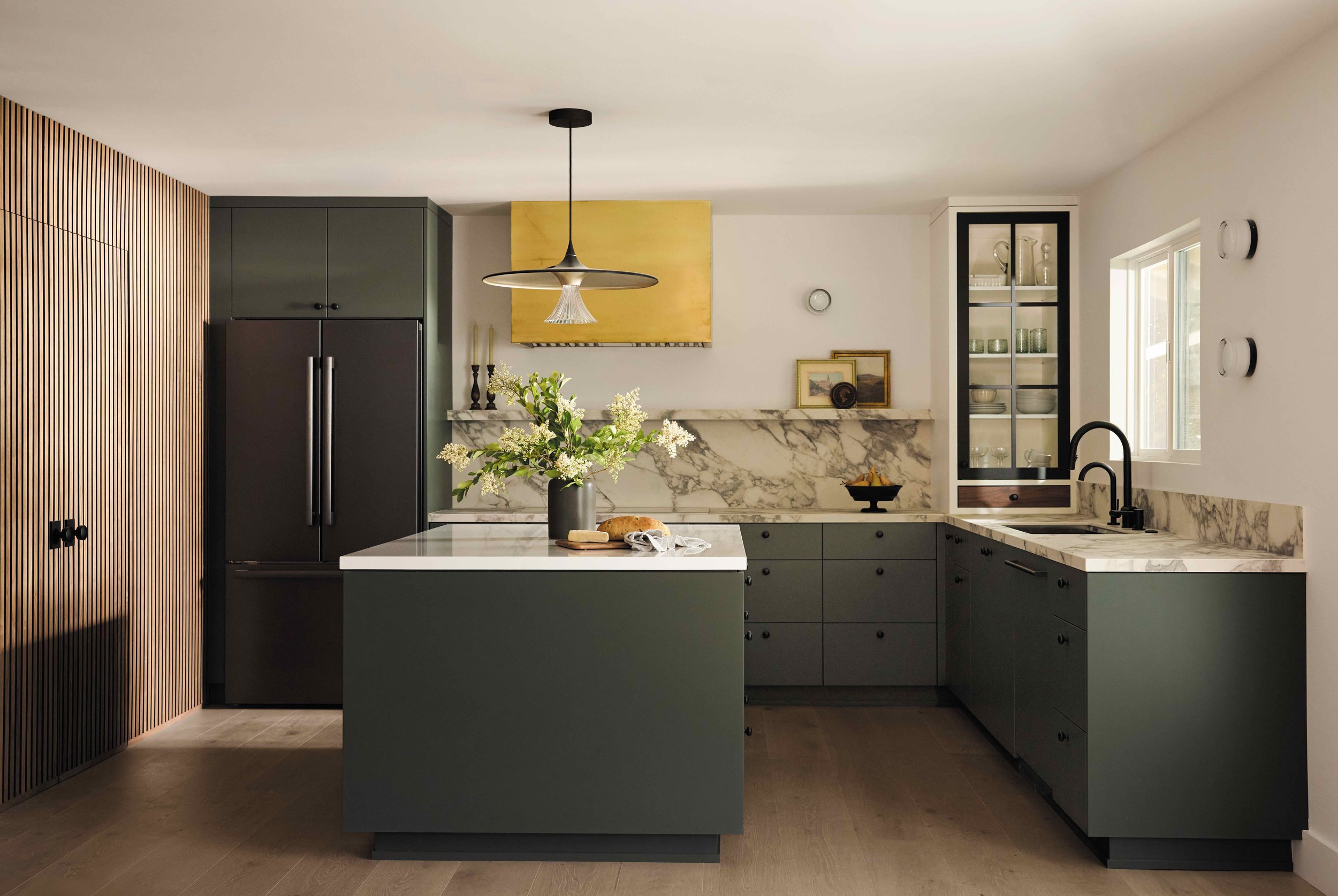 That balance continues throughout the space. Earthy green custom cabinetry introduces warmth and depth, while sleek black hardware and plumbing fixtures provide crisp contrast, pulling the palette into the present. The cabinetry’s traditional tone is offset by clean lines and thoughtful proportions, allowing the kitchen to feel collected rather than nostalgic.